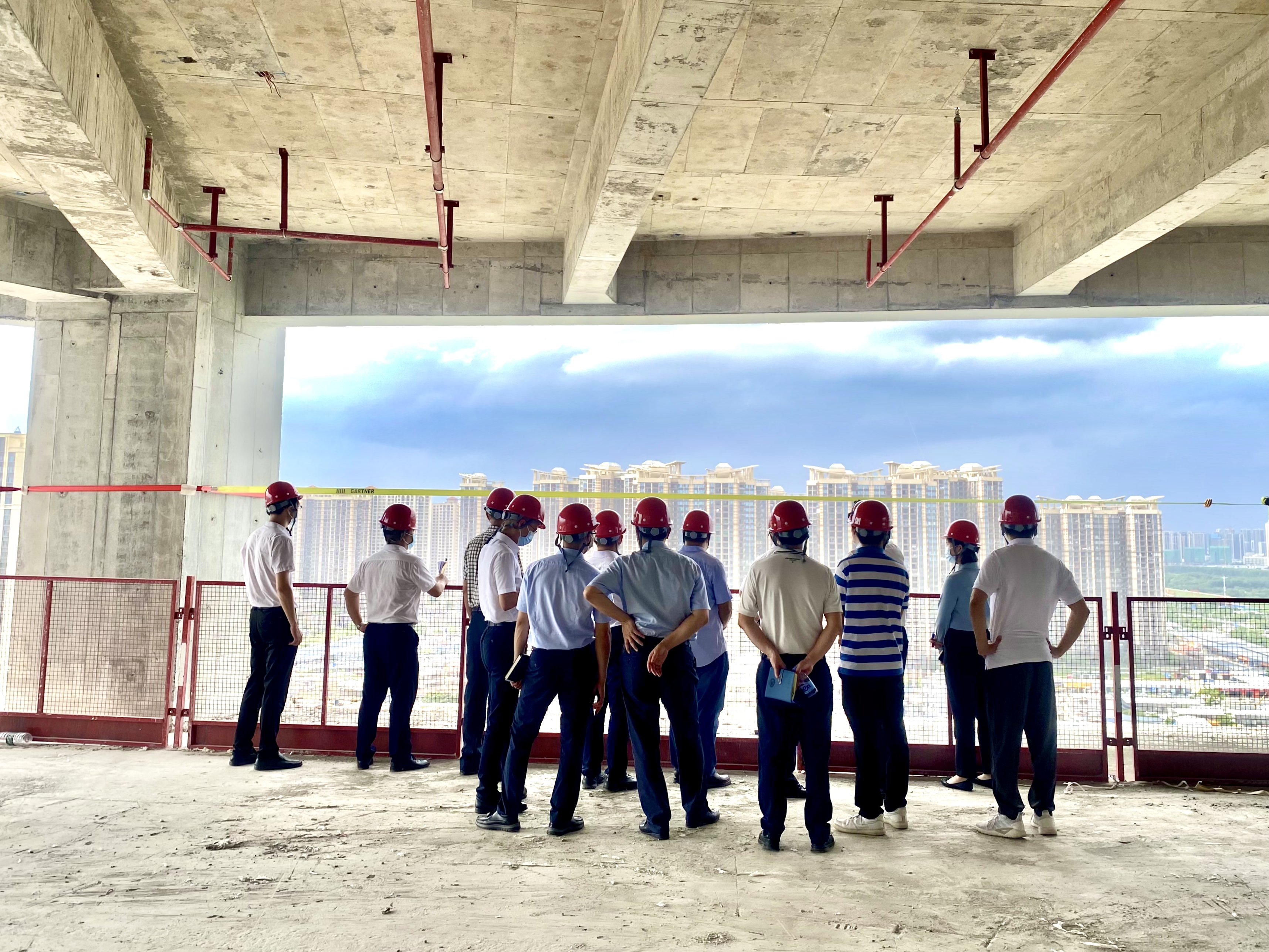 随后,领导一行登上A座产研写字楼,远眺金山新城美景,近俯园区热火朝天。当前信利康·乐创汇智慧园项目建设正如火如荼开展中,150米超高层产研写字楼A座已完成到25层,预计将于今年10月封顶,其他写字楼及住宅均已全部封顶,项目正在参与“省优质结构奖”评审。通过实地考察,项目建设运营以及“省优”评审得到了领导的认可。