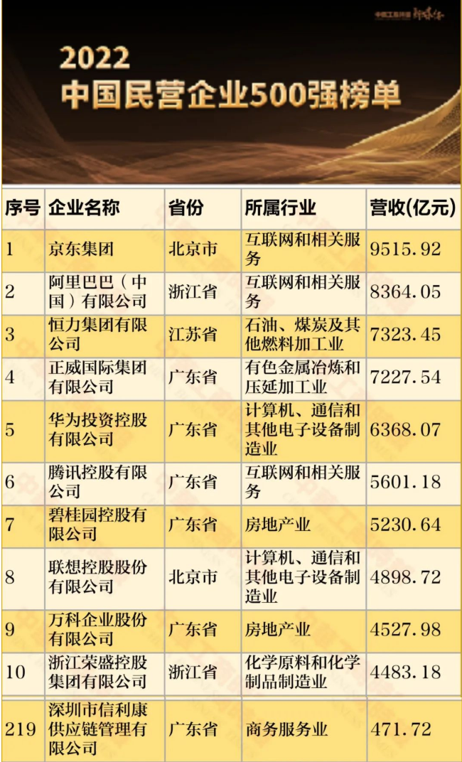 9月7日,全国工商联发布2022中国民营企业500强调研分析报告,并公布了“2022中国民营企业500强榜单”、“2022中国制造业民营企业500强榜单”和“2022中国服务业民营企业100强榜单”三个榜单。信利康连续6年上榜“2022中国民营企业500强榜单”位踞第219位,比上一年提高133位;同时入选“2022中国服务业民营企业100强榜单”位踞第61位。今年是全国工商联连续组织开展的第24次上规模民营企业调研,共有8602家年营业收入5亿元以上的企业参加。民营500强的营业收入总额38.32万亿元,增长9.13%;税后净利润1.73万亿元,下降12.28%。民营企业500强入围门槛达263.67亿元,比上年增加28.66亿元;制造业民营企业500强入围门槛达125.72亿元,比上年增加25.21亿元;服务业民营企业100强入围门槛达301.16亿元,比上年减少21.61亿元。受世纪疫情冲击和“三重压力”影响,民营企业500强面临的一些突出问题值得关注。部分经营指标出现波动。500强税后净利润、销售净利率、资产净利率、净资产收益率等出现不同程度下降;行业经营效益出现分化;亏损企业数量有所增加。